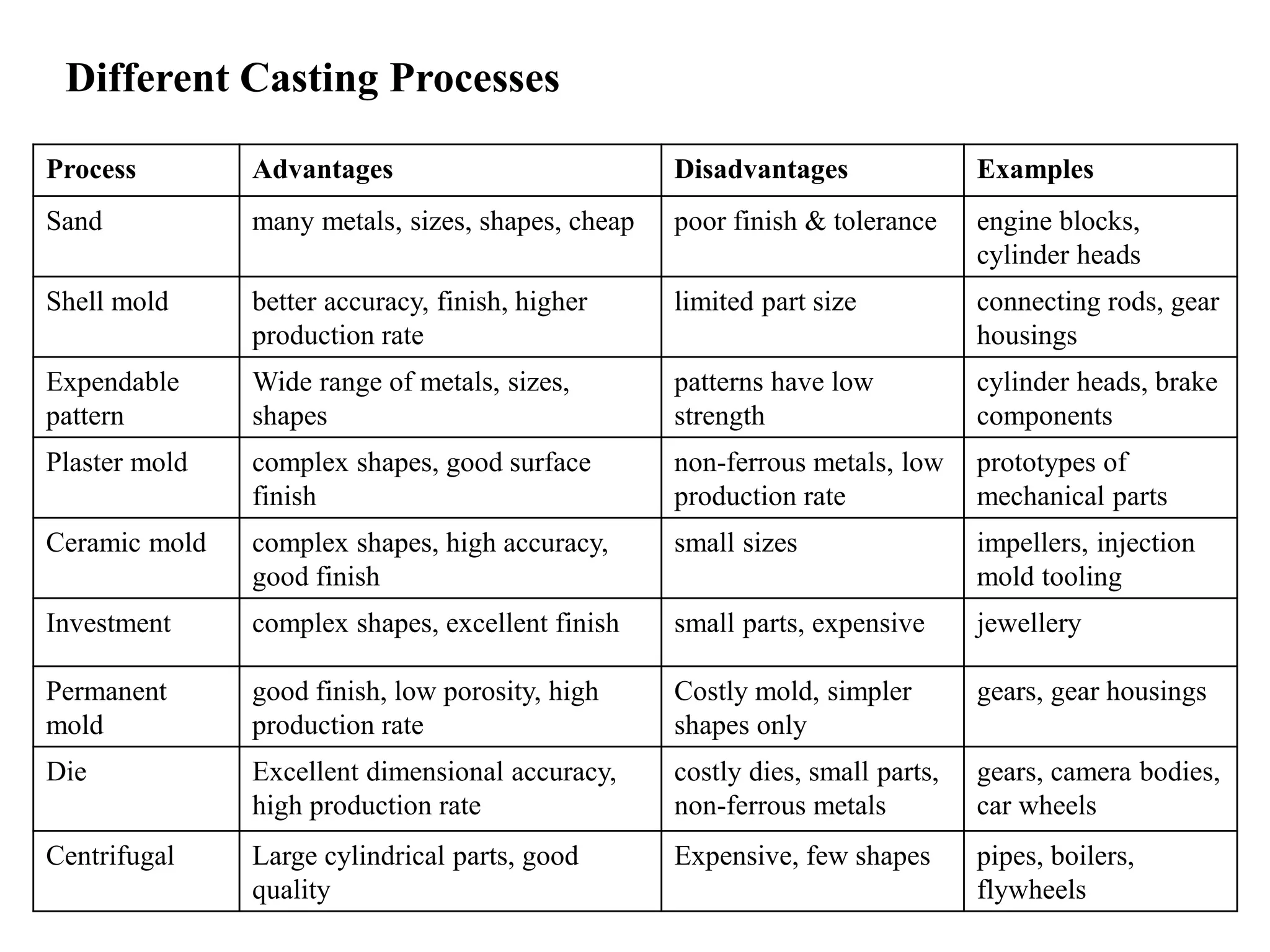 Sand casting is a cheap process that can produce many metal parts in various sizes and shapes but results in a poor finish and low tolerance. Die casting produces parts with excellent dimensional accuracy and high production rates but requires costly dies and is limited to smaller, non-ferrous metal parts like gears, camera bodies, and car wheels. Different casting processes each have advantages and disadvantages depending on the required part properties, size, material, and production quantities.