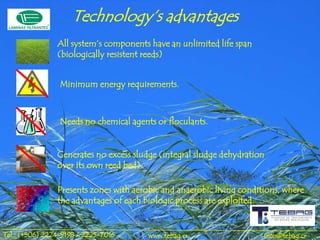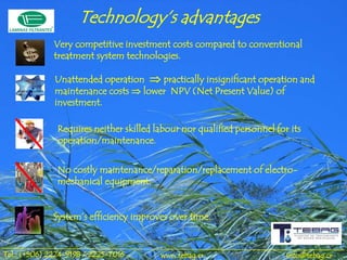 The document discusses the advantages of a wastewater treatment technology called 'láminas filtrantes,' highlighting its low investment and operational costs, efficiency in removing contaminants, and minimal environmental impact. Key benefits include unattended operation, local component sourcing, and high contaminant removal rates, making it suitable for various wastewater types and earning points for LEED certification. This technology has been proven worldwide since 1890, with over 1000 successful project implementations.