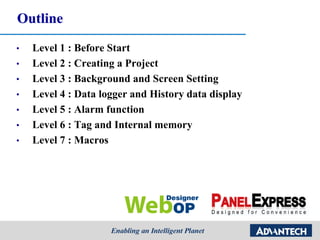 The document serves as a comprehensive user guide for the Advantech WebOP Designer software, detailing the process of creating and managing projects, setting up connections, and utilizing various components for data display and control. It covers the installation of prerequisites, step-by-step instructions on project creation, Modbus protocol usage, background settings, data logging, alarm functionality, and the use of internal memory and macros. The guide is structured in levels, ensuring users can navigate through the functionalities progressively.