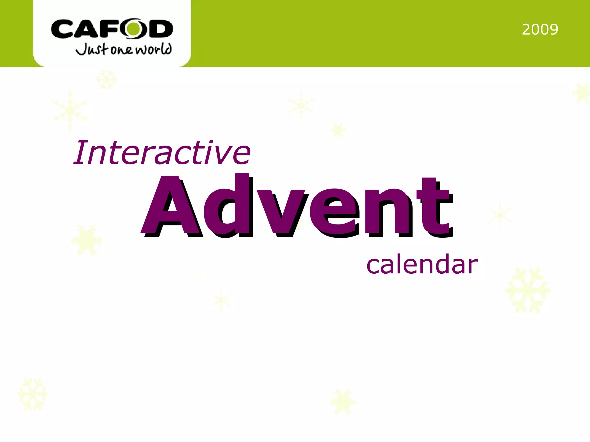 The document is an Advent interactive calendar that provides reflections and information on how to prepare for Christmas and help others in need. Each day focuses on a different theme, such as reflecting on gifts for Jesus, helping people around the world meet basic needs through charity, appreciating education resources, and learning about a health worker who helps remote villages. The calendar encourages thinking about how to make the most of opportunities and help others less fortunate.