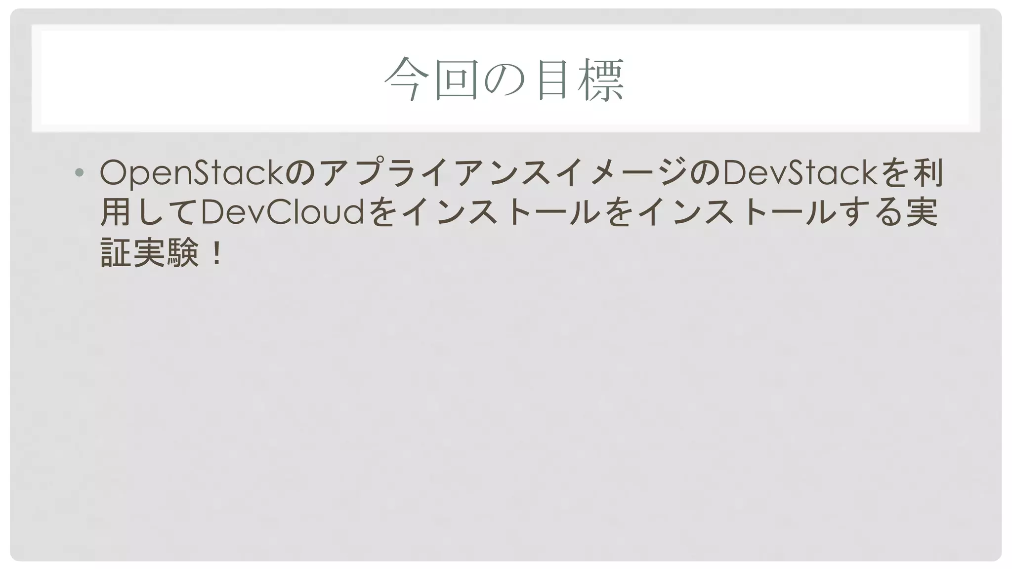今回の目標 • OpenStackのアプライアンスイメージのDevStackを利 用してDevCloudをインストールをインストールする実 証実験!