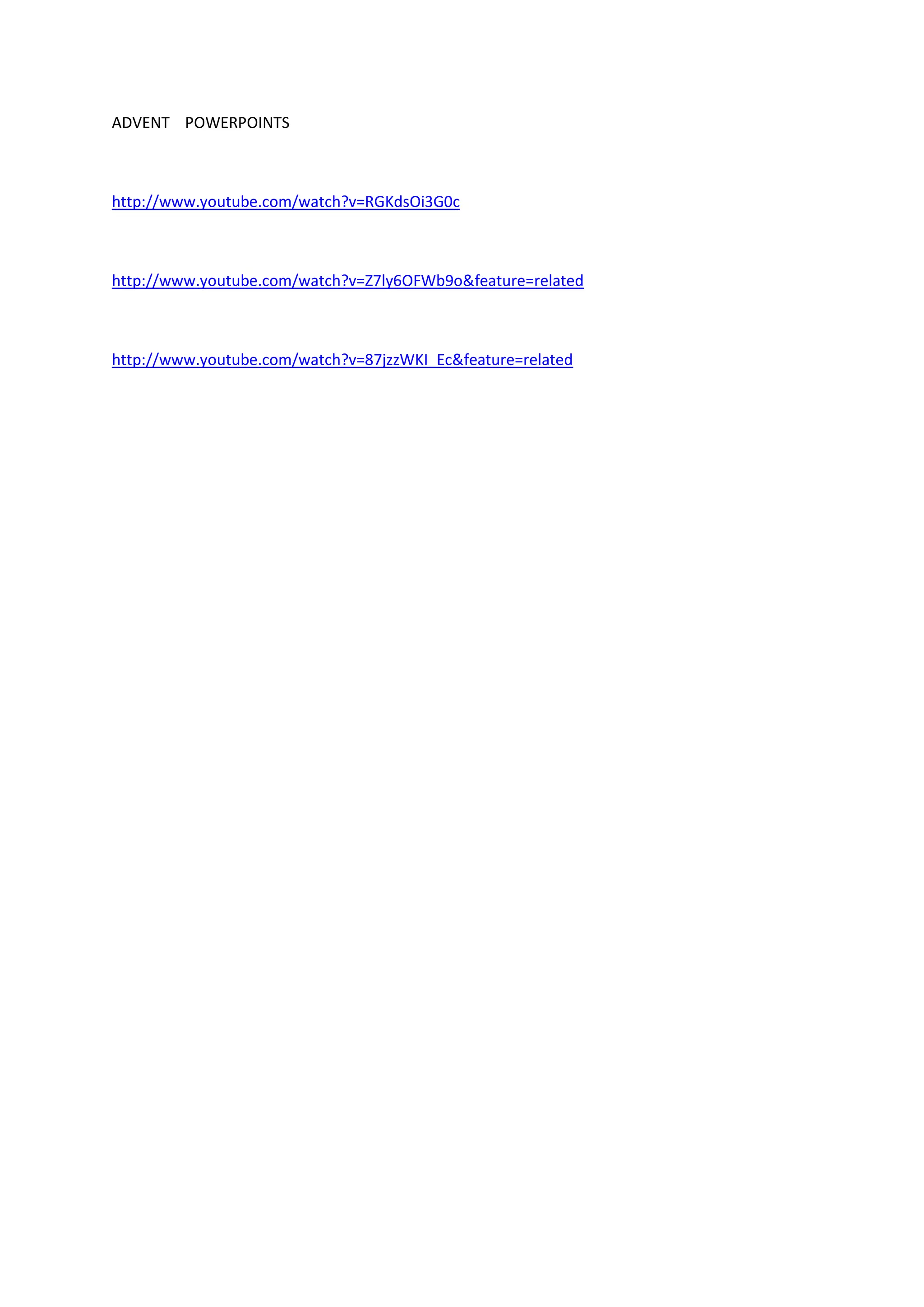 This document provides 3 YouTube links to videos related to Advent PowerPoints. The links may contain information about or demonstrations of the Advent PowerPoint software for creating digital slideshow presentations. In a concise manner, the document directs the reader to online video resources regarding a particular presentation program.