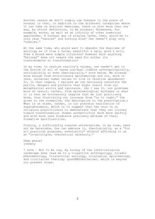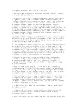 This document discusses and summarizes Matthew's thoughts on inter-religious dialogue. It analyzes Matthew's use of certain terms that are associated with either improperly dualistic or short-circuited nondual approaches. It also identifies five implicit questions addressed by Matthew's diagnoses and proposed therapies. The document then suggests categorizing these five questions in terms of anthropology, ontology, axiology, epistemology, and theology. It argues that the term "nondual" takes on distinct meanings depending on the category being discussed. The document concludes by stating that while metaphysical errors are important to address, the real problems stem from epistemological mistakes in what we think we know, and the focus should be on realizing superabund