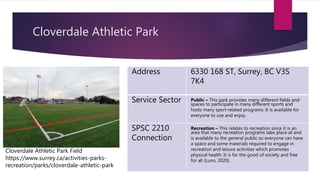 This document summarizes several recreational facilities and organizations in the Surrey, BC area. It categorizes them into four service sectors: public, commercial, voluntary, and connects each one to either recreation, physical education, or coaching. The public sector facilities like parks are free and open to all, while commercial ones like gyms require fees. Voluntary organizations rely on donations and fundraising. Coaches at clubs teach skills and safety. Overall the document shows the variety of opportunities available in the community for recreation, sports, and physical activity.