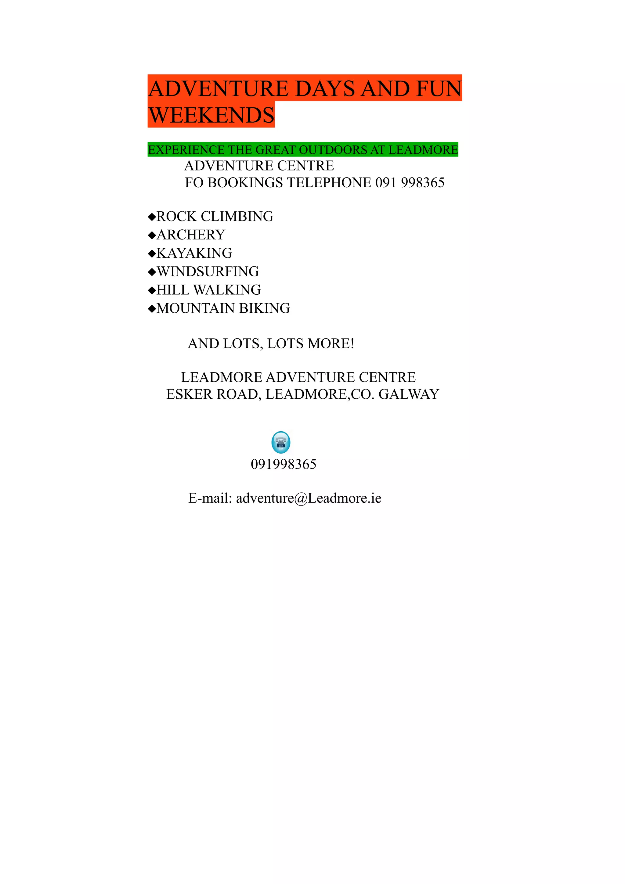 ADVENTURE DAYS ANDFUN WEEKENDS EXPERIENCE THE GREAT OUTDOORS AT LEADMORE ADVENTURE CENTRE FO BOOKINGS TELEPHONE 091 998365 ROCK CLIMBING ARCHERY KAYAKING WINDSURFING HILL WALKING MOUNTAIN BIKING AND LOTS, LOTS MORE! LEADMORE ADVENTURE CENTRE ESKER ROAD, LEADMORE,CO. GALWAY 091998365 E-mail: adventure@Leadmore.ie