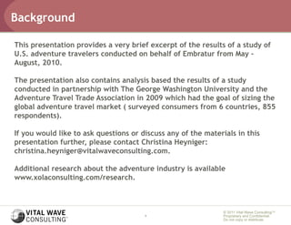 This presentation summarizes research on trends in adventure tourism and the market for adventure travel to Brazil. It found that adventure tourism is growing faster than mass tourism and now accounts for 16% of departures from North and South America and Europe. A study of U.S. adventure travelers commissioned by Embratur found that 90,000 currently travel to Brazil for adventure activities, spending an average of $1,200 per trip. The presentation outlines opportunities to increase this market by boosting tour operator bookings, independent travelers, and converting more mass tourists to participate in adventure activities. Recommendations include improving awareness of Brazil's adventure offerings through tour operators, social media, and search engine optimization.