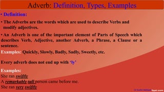 The document defines adverbs as words that modify verbs, adjectives, other adverbs, phrases, clauses, or sentences, and outlines various types including adverbs of time, frequency, place, manner, degree, affirmation, negation, reason, and interrogative adverbs. Each type is exemplified with a brief explanation and examples for clarity. The content is prepared by Dr. Sudhir Mathpati, an assistant professor at Adarsh Mahavidyalaya in India.