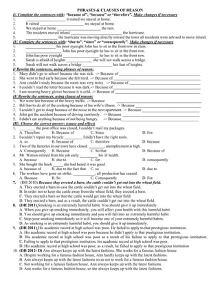 This document provides examples of using phrases and clauses of purpose, reason, concession, and opposition in rewritten sentences. It includes exercises rewriting sentences using these different types of phrases and clauses, as well as choosing the best answer with the correct usage. The goal is to practice transforming sentences by replacing words and phrases with equivalent purpose, reason, concession, or opposition structures.