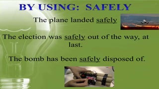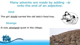 The document provides an introduction to adverbs, defining them as words that modify adjectives, verbs, or other adverbs. It includes exercises for filling in the blanks with appropriate adverbs and identifying the type of adverb used in sentences. Sample answers for the exercises are also provided.