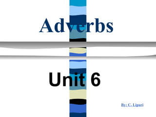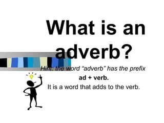 An adverb is a word that describes a verb, adjective, or other adverb. It can tell how, when, or where an action takes place. Adverbs are compared using "-er" for two things and "-est" for three or more things. Negatives are words like "no" or "not" and should not be used in the same sentence. Punctuation is used in dialogue, including quotation marks and commas. Prepositions show the relationship between nouns or pronouns. Prepositional phrases begin with a preposition and end with a noun or pronoun.
