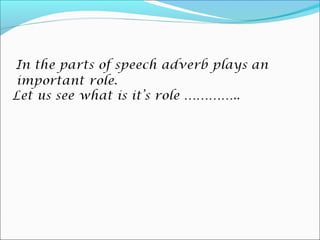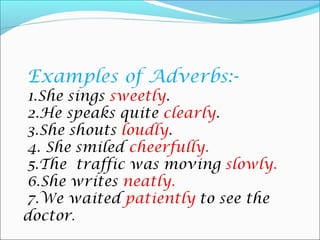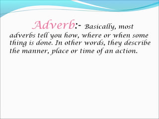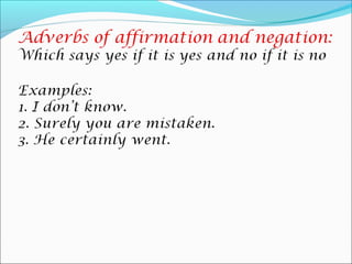 It provides examples of different adverbs and notes that many adverbs are formed by adding "ly" to adjectives. Exercises are included for students to identify different types of adverbs.