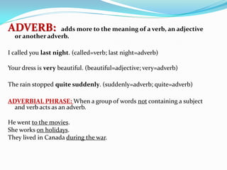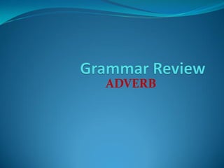 This document defines and provides examples of different types of adverbs. It discusses how adverbs add meaning to verbs, adjectives, and other adverbs. The main types of adverbs are place, time, manner, degree/quantity, and frequency. Adverbs can modify verbs, adjectives, and other adverbs. They can appear in different positions within sentences and are often used to intensify or downtone meanings.