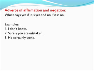 This document discusses different types of adverbs and provides examples. It explains that many adverbs are formed by adding -ly to adjectives, though some words ending in -ly are not adverbs. It defines different types of adverbs including manner, place, time, frequency, purpose/reason, quantity/degree, and affirmation/negation. Examples are provided for each type of adverb like "happily" for manner and "tomorrow" for time. The document concludes by providing a practice exercise with blank spaces to insert different adverbs.