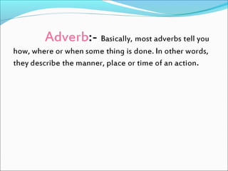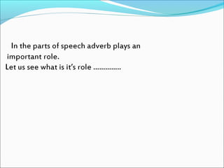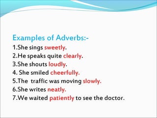 This document discusses different types of adverbs and provides examples. It explains that many adverbs are formed by adding -ly to adjectives, though some words ending in -ly are not adverbs. It defines different types of adverbs including manner, place, time, frequency, purpose/reason, quantity/degree, and affirmation/negation. Examples are provided for each type of adverb like "happily" for manner and "tomorrow" for time. The document concludes by providing a practice exercise with blank spaces to insert different adverbs.