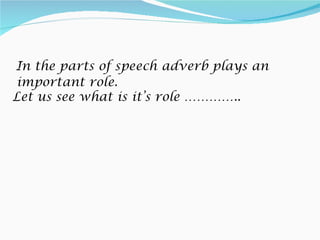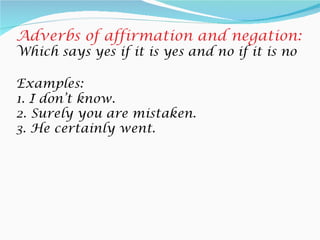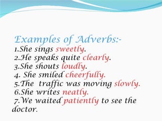 It provides examples of different adverbs and has exercises for learners to identify adverbs of time, place, manner and other types in sentences.