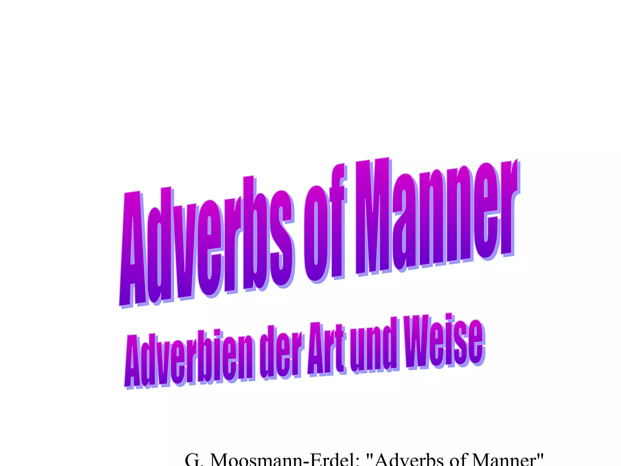Adverbs of manner are used to describe how an action is performed. They are typically formed by adding "-ly" to an adjective, such as "slow" becoming "slowly". Some adverbs have irregular forms that must be memorized. Adverbs of manner are placed after the verb in simple sentences and after the object in sentences with an object. They can be compared using "-er" and "-est" or "more" and "most". Worksheets are provided to practice using adverbs of manner.