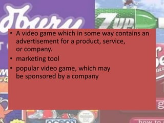 Advergames are video games that contain advertisements for products, services, or companies. They are used as a marketing tool by companies to promote their brands through sponsoring popular video games. There are different types of advergames, including those on company websites where advertisements are integrated directly into games, and traditional commercial video games that feature product placements or in-game ads. Common methods for including ads in games involve signage, integrating products into game play, ads during transitions, or ads around the game screen. Advergames provide advantages to advertisers by gaining users' uncluttered attention across large demographics at a relatively low cost.