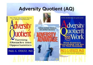 The document discusses the concept of Adversity Quotient (AQ), which measures how effectively one responds to difficulties in life. AQ is determined by four dimensions - Control, Ownership, Reach, and Endurance. The document provides tips to improve one's AQ, such as taking action to regain control over adversities, limiting their impact, and maintaining an optimistic perspective.