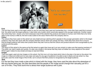 - Text uses humor and jokes related to the images to engage the target audience. Simplicity and recognizing branding colors/fonts is important.