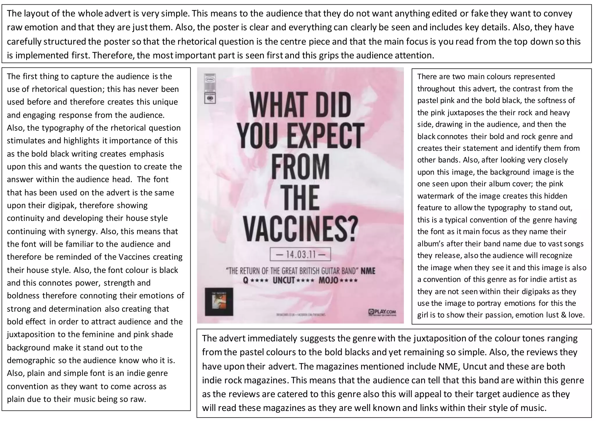 The document analyzes the design and typography used in an advertisement for the band The Vaccines. It notes that the use of a rhetorical question engages the audience. The bold black typography draws emphasis and demands an answer from viewers. Continuity is shown through using the same font from the advertisement to their album packaging. The simple font and layout conveys that the band wants to appear raw and unedited. Key details are clearly visible, with the rhetorical question at the center to immediately grip attention. The color scheme and referenced magazines suggest the indie rock genre. The contrast of pastel pink and bold black softens yet boldly identifies the band's style. Hidden details connect the background image to their album cover, a convention