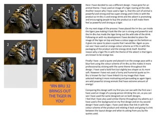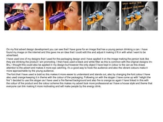 The document describes two advertising designs for an energy drink. The first design features an edited image of a young person drinking from a can of the product with the brand's packaging design applied. Orange and black colors are used to mimic the original brand's style. The second design features an image of a roaring tiger with the can in its jaws, representing the energy and power provided by the drink. Orange is again used throughout to match the brand's colors. Both designs aim to motivate and persuade young people to purchase the product by relating its energizing effects to the powerful images used.