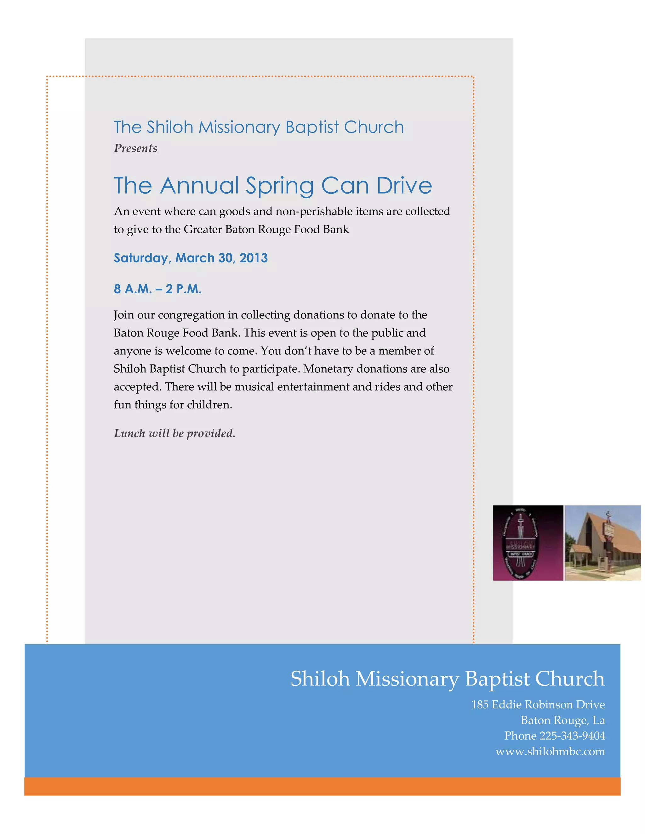The Shiloh Missionary Baptist Church will hold its Annual Spring Can Drive on March 30th from 8am to 2pm to collect canned goods and other non-perishable food items for the Greater Baton Rouge Food Bank. The event is open to the public and will include musical entertainment, children's activities, and free lunch.