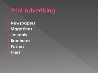This document outlines various forms of advertising media including print advertising using newspapers, magazines, journals, brochures, posters and fliers; outdoor advertising such as billboards, kiosks, and banners on buses and trains; broadcast advertising on television, radio and the internet; and other means like covert advertising in movies, surrogate advertising indirectly using celebrities, and public service advertising for social causes. It provides examples of each type of advertising media and concludes by thanking the reader and wishing them happy advertising.
