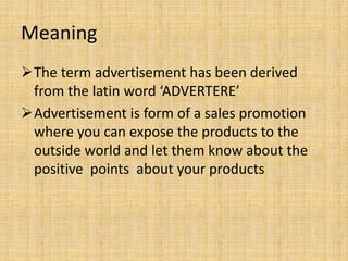 This document provides information on advertisement copy, including its meaning, definition, components, and effective layout. Advertisement copy is written material used in print, broadcast, or other media to promote products or services. It should be attractive, informative, convincing, memorable, interesting, simple, realistic, and educative. The layout of copy typically includes a headline to grab attention, content to describe the product benefits and features through text, images, or other media, confirming marks like logos, and contact information for customers. Effective advertisement copy uses various approaches like descriptive, institutional, suggestive, educative, or benefits-focused messaging to promote products or services.