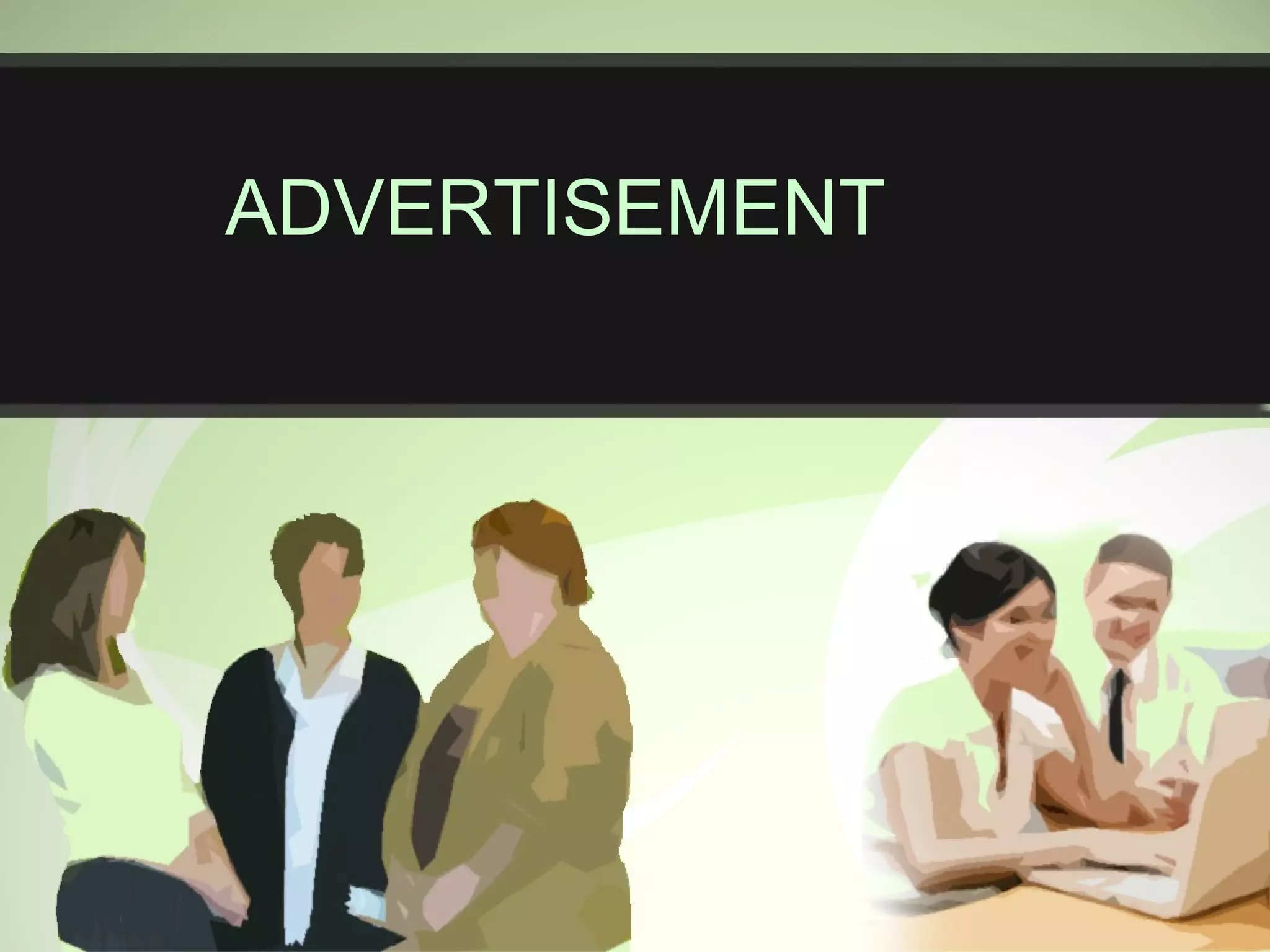 The document defines advertising as a paid form of non-personal communication designed to induce people to buy ideas, goods, or services. It aims to differentiate products from competitors, communicate product information, urge product use, expand distribution, and increase brand loyalty and preference while reducing costs. Advertising benefits manufacturers by increasing and stabilizing sales, retailers by guaranteeing quick sales with minimal effort, and consumers by aiding decisions and ensuring better quality, affordable options. It also benefits society by raising living standards and employment while upholding culture.