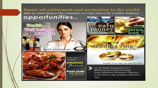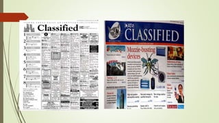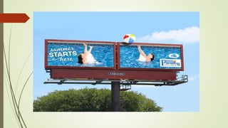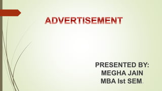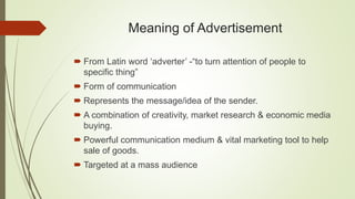 This document defines advertisement and discusses various types of advertisements. It begins by explaining that advertisements turn people's attention towards specific things and represent the message of the sender. It then lists the top 10 advertising agencies in the world and provides details about Ogilvy & Mather, the largest agency. Finally, it categorizes different types of advertisements such as outdoor, indoor, radio, TV, and online advertisements.