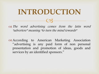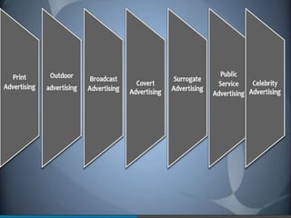 The document discusses various forms of advertising, emphasizing its purpose to promote products, enhance goodwill, and support sales. It categorizes advertising into print, outdoor, broadcast, covert, surrogate, public service, and celebrity advertising, each serving different strategic purposes. The content highlights the importance of effective communication and the evolving nature of consumer responses to advertisements.