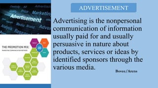 The document discusses the definition and history of advertising. It defines advertising as nonpersonal, paid communication through media to promote products, services, or ideas. The document then outlines the history of advertising from ancient times through the Industrial Revolution. It describes how advertising evolved from promoting locations and services to mass production leading to a focus on products, sales, and marketing to understand consumer wants and needs.