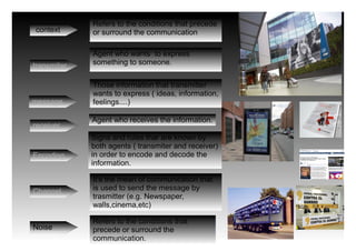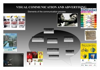 This document discusses visual communication and advertising. It describes the basic elements of the communication process including the context, transmitter, message, receiver, encoding, channel, and noise. It then discusses visual communication, noting that advertisements can include text and images in print or audiovisual formats. The typical structure of an advertisement is described as including an image, motto, small text, and trademark or logo. Finally, the document outlines some common advertising strategies such as being objective, comparative, aesthetic, or spectacular. It also briefly discusses subverting advertisements to convey a political message.