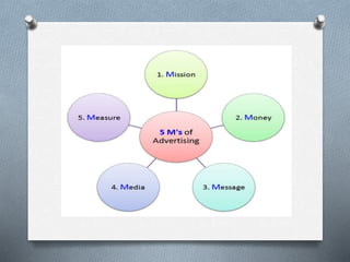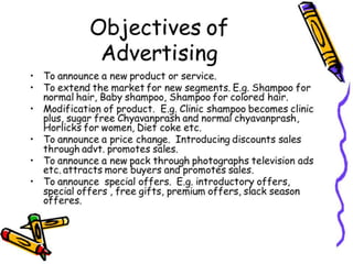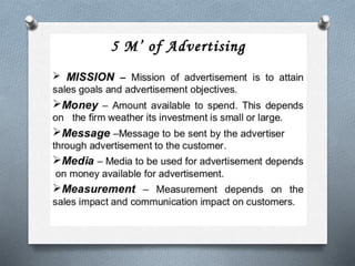 Advertising is a structured approach to communicating information about products or services through various channels, including television, online, and print media. It has distinct features such as being a paid and impersonal form of communication aimed at promoting goods and services, while also having advantages like increased sales and disadvantages such as high costs and potential negative social impacts. Effective advertising requires adherence to legal standards and a thorough understanding of the target audience.