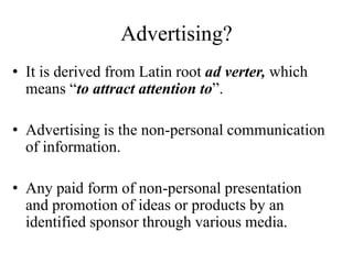 The document discusses advertising's definition, objectives, and various forms, emphasizing its role in attracting attention and promoting products. Key objectives include informing potential customers, persuading them to buy, reminding existing customers, and reinforcing brand loyalty. The document also covers the history of advertising and highlights specific advertising types, such as print, broadcast, and online, as well as notable case studies and social impact initiatives.