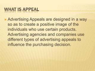 This document discusses different types of advertising appeals used to influence purchasing decisions. It outlines snob appeal, which creates desire for luxury products. Brand appeal targets those who want to make a brand statement. Bandwagon appeal suggests people should buy a product because everyone else is doing so. The document provides examples of snob, brand, and bandwagon appeals used in advertising campaigns.