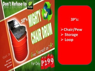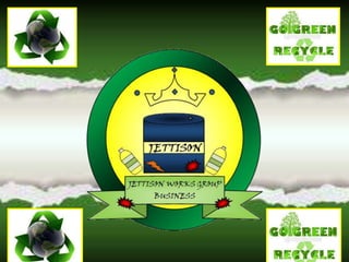 Jettison Works Group Business is a privately owned business that manufactures and sells recycled chair drum furniture called 3P's Mighty Chair Drum. The business is aiming to target 60% of the office and school furniture market segments consisting of classes A, B, and C. Jettison Works Group Business will utilize a variety of advertising media like TV commercials, fliers, and tarpaulins over a 6 month period to promote their recycled furniture and reach at least 80% of their target market.