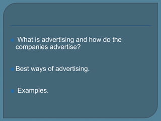 The document discusses advertising and provides examples from Coca-Cola. It summarizes that advertising involves communicating to persuade people to buy products. Most companies use advertising agencies to create ads through various media like newspapers, TV, and the internet. It then discusses Coca-Cola in more detail, noting that it is one of the largest advertisers and helped shape the modern image of Santa Claus through ads starting in the 1920s. Coca-Cola continues to feature Santa in its Christmas advertisements each year.