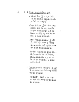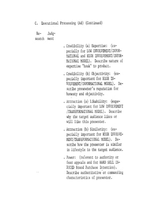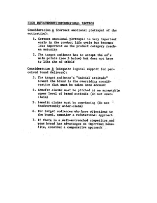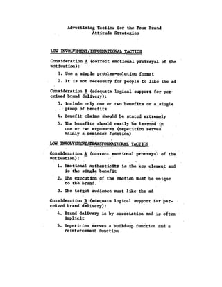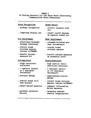 The document proposes a general structure for constructing models of how advertising works. It identifies four fundamental advertising communication models based on the communication objectives of brand awareness and brand attitude. The models help set complete advertising objectives, assist creative specialists, and increase validity of advertising pre-tests. The document outlines the components and steps of an advertising communication model, including target audience, decision-maker, communication effects, and objectives. It differentiates the models based on whether the objective is brand recall or brand recognition for brand awareness, and discusses tactics for each.