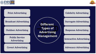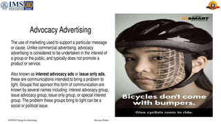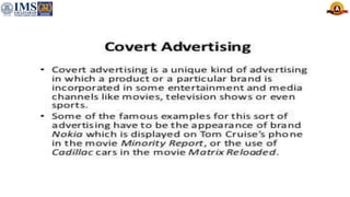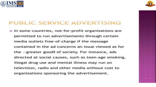 This document discusses advertising, including its definition, key players, functions, and ethics. It defines advertising as a promotional activity aimed at selling products or services to a target audience. The key players in advertising are identified as the advertiser, agency, media, suppliers, and audience. The functions of advertising are described as building awareness, providing information, persuading people, and reinforcing purchases. The document also discusses ethics and truths in Indian advertising, noting standards bodies like ASCI that provide guidelines to ensure truthfulness and avoid misleading or offensive advertising.