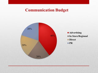 This marketing communication plan summarizes Target's history, mission, marketing strategy, and current marketing objectives. It provides an overview of Target as a company, including its strengths, weaknesses, opportunities, threats, target markets, and product analysis. The plan then outlines Target's current communication objectives, proposed advertising strategy and budget, and a two-year integrated marketing communication strategy focusing on advertising, promotions, direct marketing and public relations.