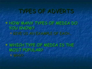 The document discusses different types of advertisements across various media like television, radio, newspapers and magazines. It asks the reader questions about advertisements they have seen and liked. It then prompts the reader to design their own magazine advertisement for a product of their choosing, including elements like a slogan, product image, logo and text describing key features.