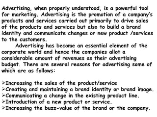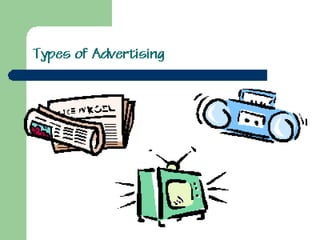 The document discusses different types of advertising including print, outdoor, broadcast, covert, surrogate, public service, and celebrity advertising. It outlines the advantages and disadvantages of each type. The key types covered are print media like newspapers and magazines, outdoor advertising methods like billboards and signs, broadcast media like television and radio, and covert advertising placement in movies and television shows.