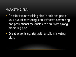 3. Consider timing, scheduling, proven advertising methods, and follow through including evaluation to ensure the plan's success. An effective plan comes from thorough marketing research and strategy.