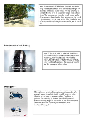 This document discusses various advertising techniques used to persuade consumers. It describes techniques such as using beautiful models to promote products by implying the product will make the consumer more attractive. It also discusses using celebrities, appealing to consumers' desires for independence or intelligence, promoting products as enhancing one's lifestyle, and using rhetorical questions or incomplete claims to encourage purchases without evidence.