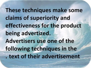 The document summarizes 10 common advertising techniques used to make claims of a product's superiority or effectiveness. These techniques include using vague or weasel words, making unfinished comparisons, claiming uniqueness without evidence, stating trivial facts, using flattery or rhetorical questions to imply qualities without proof, and identifying problems without evidence the product is the solution. The goal of these techniques is to seem to promote the product without making direct claims that can be disproven.