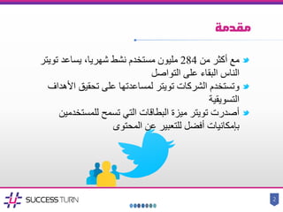 تتناول الوثيقة إعلانات تويتر باستخدام البطاقات الإعلانية، التي تساعد الشركات على تحقيق أهدافها التسويقية من خلال استهداف المستخدمين بطرق فعالة. تُبرز الوثيقة ميزات هذه البطاقات مثل استهداف الجمهور وتحقيق تواصل أفضل مع المتابعين، مما يسهم في زيادة الوعي بالعلامة التجارية. تقدم البطاقات العديد من الأنواع التي تشمل المحتوى المرئي والنصوص، مما يُعزز من فعالية الإعلانات على المنصة.