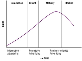 The document provides information about advertising, including its definition, objectives, and techniques. It discusses how advertising aims to turn people's attention towards specific products or services by communicating information to induce people to buy. The summary also mentions that advertising agencies can help plan strategies to differentiate products from competitors and communicate information to consumers. Finally, it states that advertising works by moving potential buyers through stages from awareness to interest to desire to action.