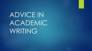 This document provides advice for academic writing. It recommends developing an argument with a clear thesis, doing research by reading and taking notes, and organizing the essay in an effective order. Good writing practices include starting early, using writing for exploration, revising extensively, and proofreading. When developing reasoning, students should understand key concepts and terms, ask questions about the topic, and form a tentative thesis statement. Effective research involves note-taking methods like index cards and outlining, and planning to ensure a logical argument. The introduction should engage readers and provide context for the focus, while the conclusion should broaden the discussion and convey implications beyond the scope of the essay.