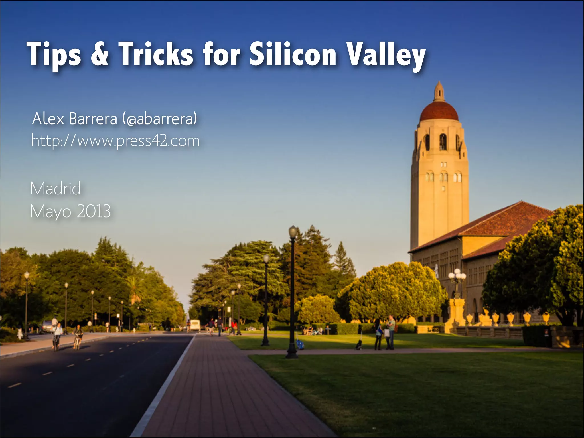The document discusses tips for navigating Silicon Valley, emphasizing preparation for meetings, clarity of goals, and the importance of follow-up. It highlights the need for cultural awareness and humility during interactions, and suggests making connections by inviting contacts to Spain. Overall, it encourages a fun and engaging approach to business relationships.